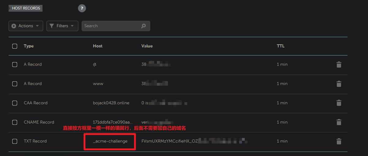 在宝塔面板上申请Let's Encrypt证书DNS验证时却总是验证失败,是因为宝塔面板提示在DNS里配置的TXT验证的host为“_acme-challenge-网站域名”但实际上不需要后面的域名,只填写_acme-challenge即可(如下图)。再次验证即可成功。